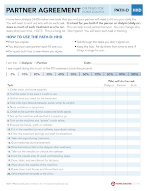 Who is going to do what when it comes to home treatments? It’s best for the person who needs dialysis (dialyzor) to do as much as possible. You and your dialyzor will need to work that out in a way that suits you best. Download the tool for home hemodialysis (HHD) or peritoneal dialysis (PD) and follow the steps.