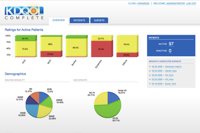 An article on the KDQOL Complete home page has background on the survey and tips to administer, score, interpret, and report the results to patients and talk with them about low, average, and above average scores. It also shares some interventions that have been shown to improve scores and tips for incorporating the results into the psychosocial assessment, patient plan of care, and QAPI.